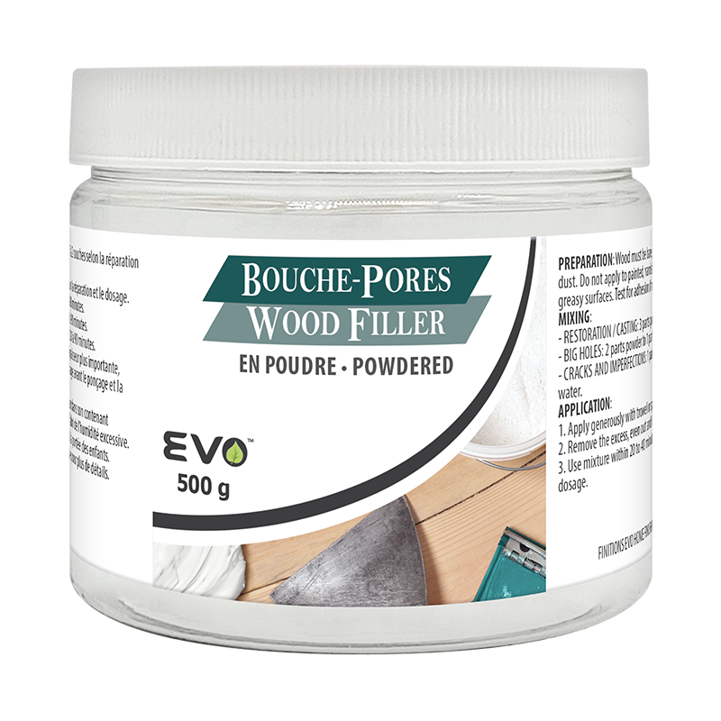 Le Bouche-Pores en Poudre EVO™ est un produit bicomposant à mélanger avec de l’eau conçu pour les travaux de restauration du bois autant intérieur qu’extérieur. Grâce à sa résine à très haute dureté, il rebouche les trous ainsi que les fissures de toutes tailles et permet la reconstitution de parties manquante en plus de se sculpter très facilement. Sa formulation adhère parfaitement sur tous les bois, agglomérés et contreplaqués. Cette pâte à bois en poudre est particulièrement appréciée puisqu’elle absorbe bien les teintes lors de la finition. Ce produit est disponible en 5 couleurs représentant bien les essences de bois populaires. De plus, ce bouche-pores est facile à utiliser, résiste à l’eau et est sans solvant. Puisqu’il sèche très rapidement, il permet d’être poncé dans un délai moindre que les pâtes à bois traditionnelles et peut être verni, peint, teint, scié, cloué ou vissé sans aucun souci. Une fois le produit sec, vous serez agréablement surpris de constater la solidité de la surface et ainsi, profiter d’une réparation durable dans le temps.