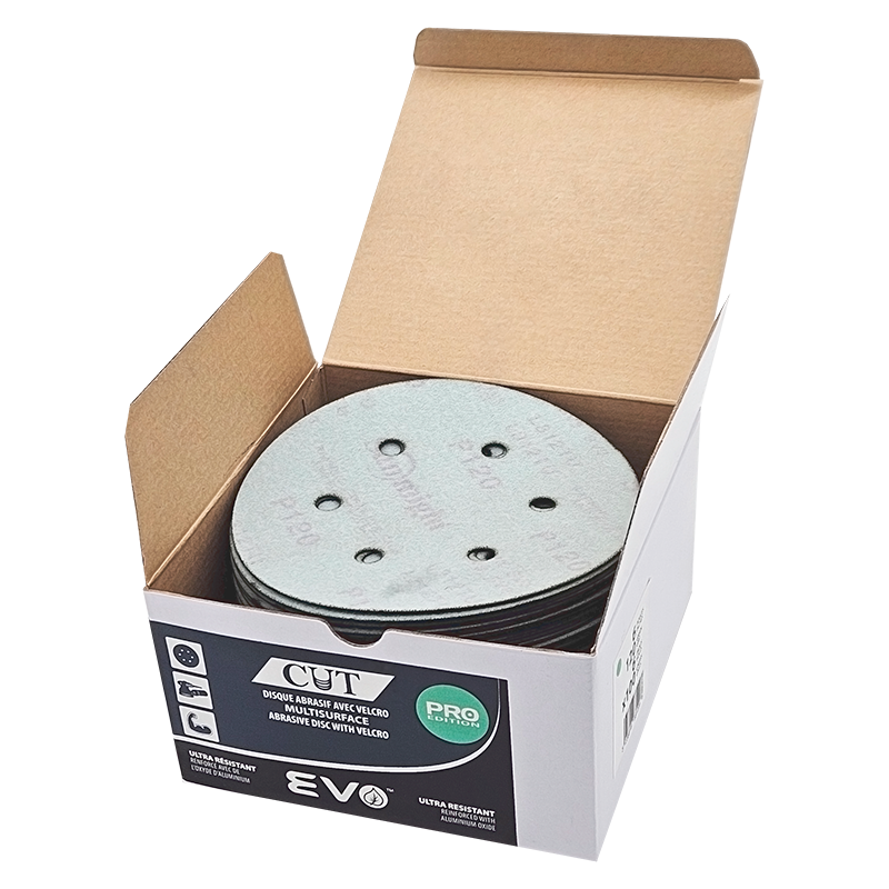 Les disques abrasifs EVO™ CUT édition PRO est une nouvelle technologie d’abrasif beaucoup plus durable qui ne se déchire pas facilement. Il procure une durée de vie très élevée et offre une finition dépassant les attentes des industries et des utilisateurs les plus rigoureux. L’édition PRO intègre les meilleures pratiques de fabrications et offre un produit qui est réellement destiné aux projets de ponçage de grande envergure. L’endos de type ‘film’ renforcé de polyester permet une performance inégalée même sur les coins, les bords et les formes irrégulières. Étant un abrasif considéré comme ‘semi-ouvert’, il est surtout utilisé sur des surfaces de bois franc, d’époxy et de métaux.