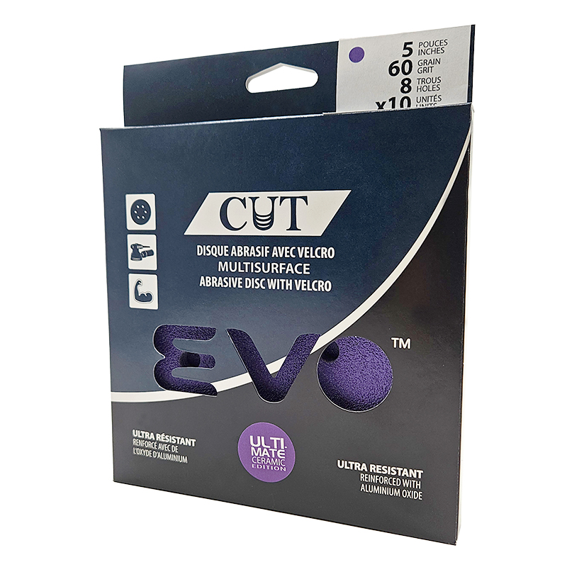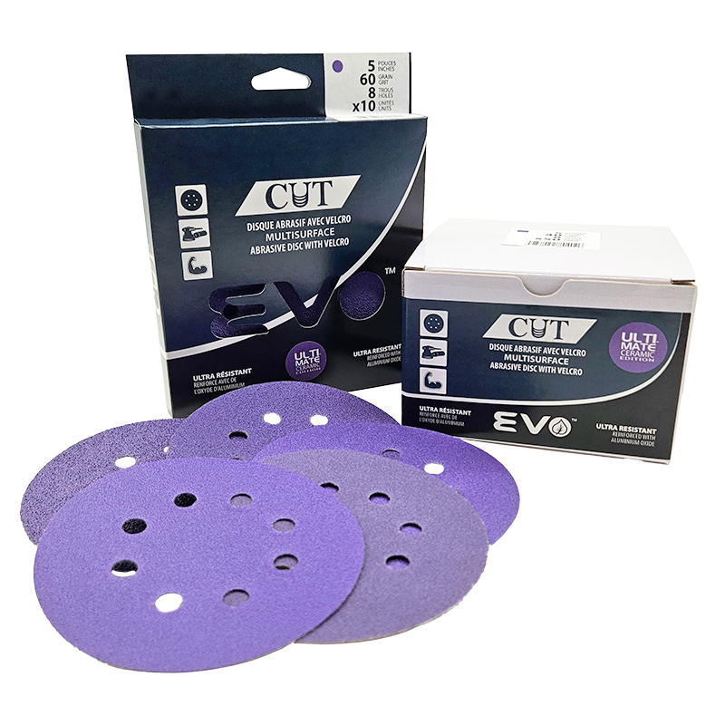 Le disque abrasif EVO™ CUT édition ULTIMATE est une nouvelle technologie d’abrasif renforcés de céramique beaucoup plus durable, qui ne se déchire pas facilement. Il procure une durée de vie extrêmement élevée et offre une rapidité d’exécution dépassant les attentes des industries et des utilisateurs les plus rigoureux. L’édition UTIMATE intègre les meilleures pratiques de fabrications et offre un produit qui est réellement destiné aux projets de ponçage de grande envergure. L’endos de type ‘film’ renforcé de polyester permet une performance inégalée même sur les coins, les bords et les formes irrégulières. Étant un abrasif considéré comme ‘semi-ouvert’, il est surtout utilisé sur des surfaces de bois franc, d’époxy et de métaux.