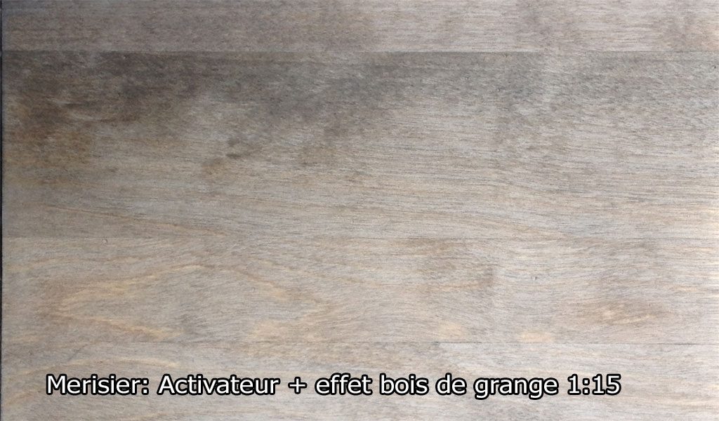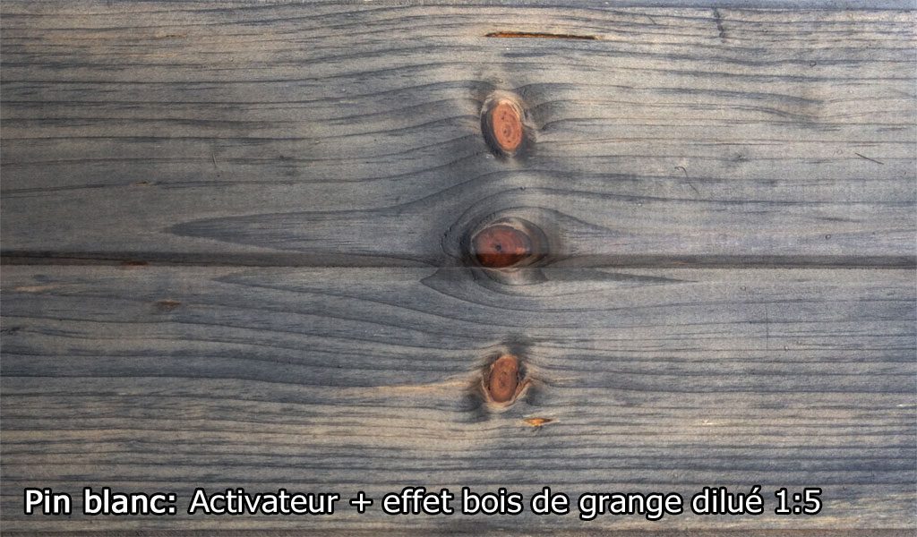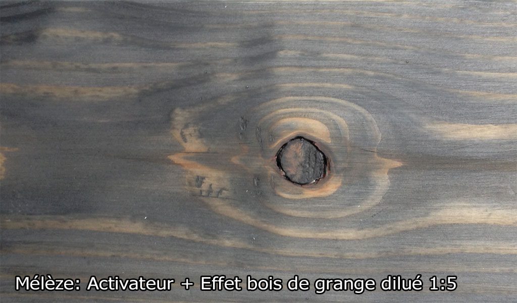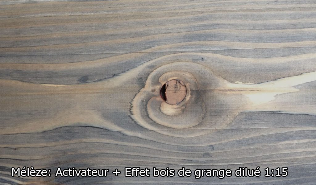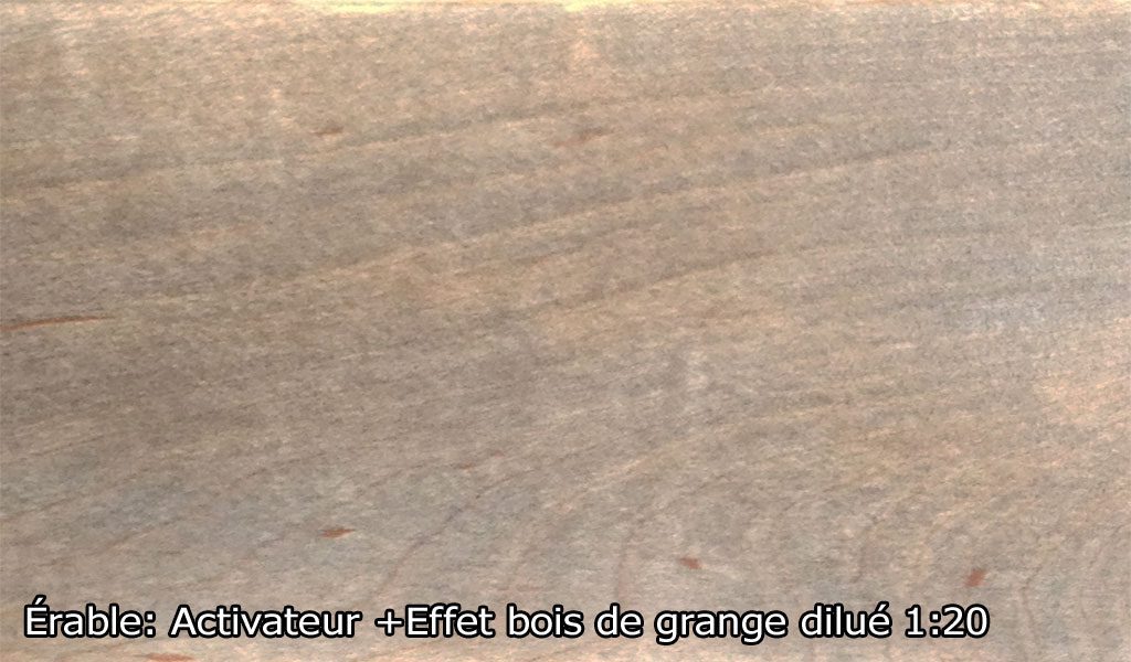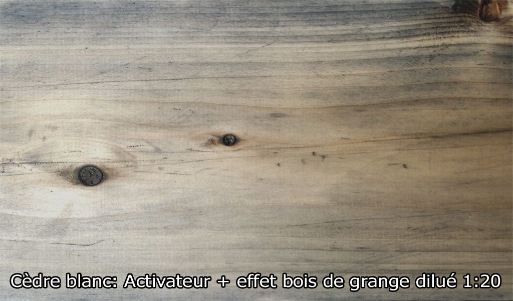 Effet bois de grange donne un effet vieilli au bois, le fait grisonner et en fait ressortir les veinures. Il est idéal pour donner un effet grisonnant sur la plupart des bois, imitant le bois des granges vieillit pas le temps. Il peut être utilisé seul seulement sur certaines bois franc et sur le cèdre blanc (selon nos test). Pour les autres essences, apprêter la surface au préalable avec l’Activateur de tanin. L’activateur accentue la réactivité du bois, modifie la couleur et augmente considérablement l’effet. Les teintes obtenues avec Effet bois de grange varient selon l’essence de bois (allant du brunâtre, au gris, au noir et au verdâtre) et l’intensité des teintes peut être ajustée en modifiant le ratio de dilution. L’utilisation de l’Activateur de tanin augmente le vieillissement et modifie la teinte. Il s’utilise autant sur le bois plané que brossé ou brut.