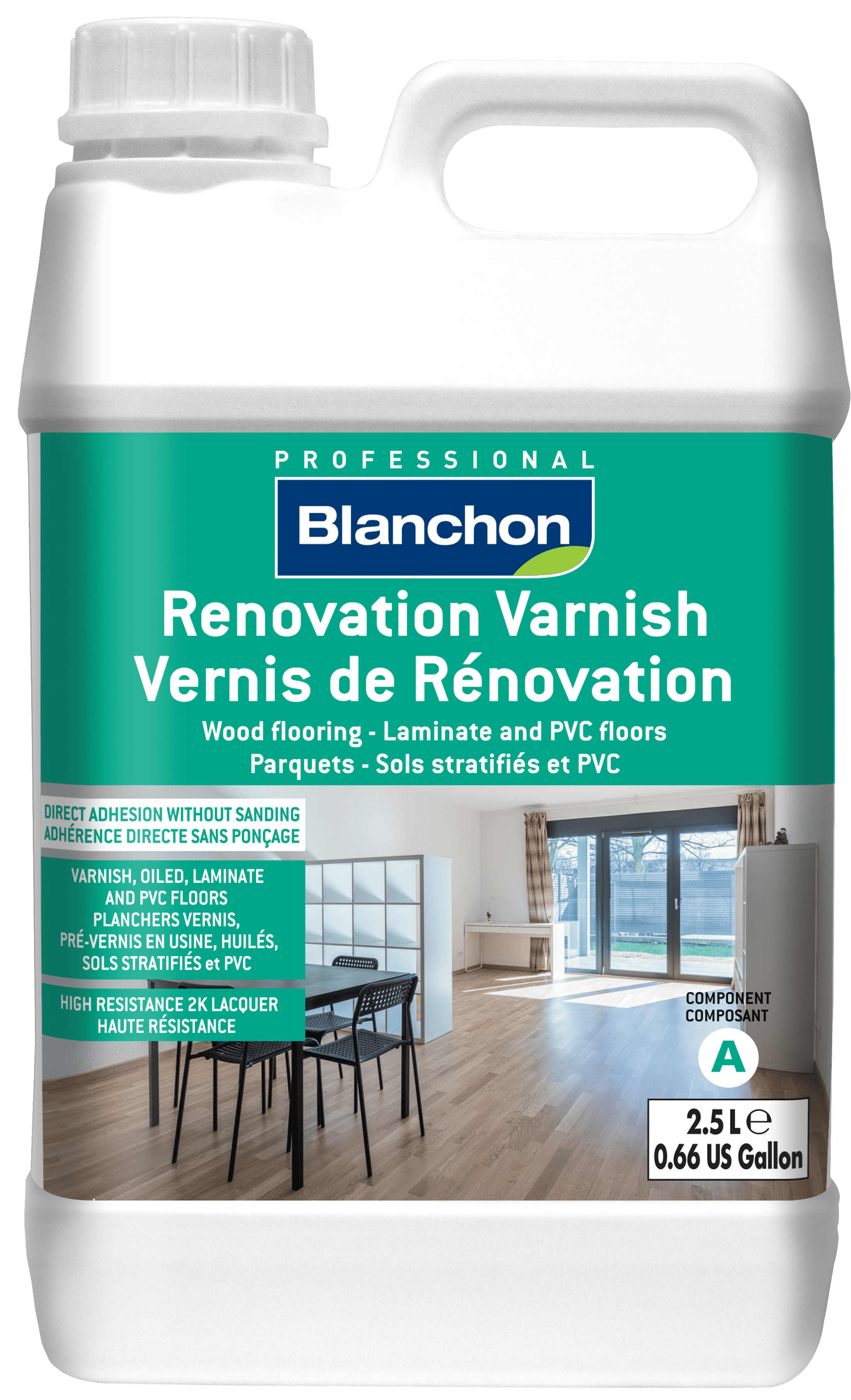 Le VERNIS DE RÉNOVATION de BLANCHON permet de rénover durablement les planchers vernis, huilés, pré-vernis, pré-huilés ainsi que les sols stratifiés et PVC usés et ternis (1), sans remise à nu ou remplacement du revêtement. Sa formulation unique avec un haut pouvoir garnissant et l’ajout d’un durcisseur garantissent une adhérence parfaite ainsi qu’une haute résistance au trafic et aux agressions chimiques. La mise en œuvre du VERNIS DE RÉNOVATION est simple et rapide : il s’applique directement sans primaire d’adhérence. Sa préparation de surface simplifiée et son application en 1 seule couche permettent une remise en service rapide des locaux.
